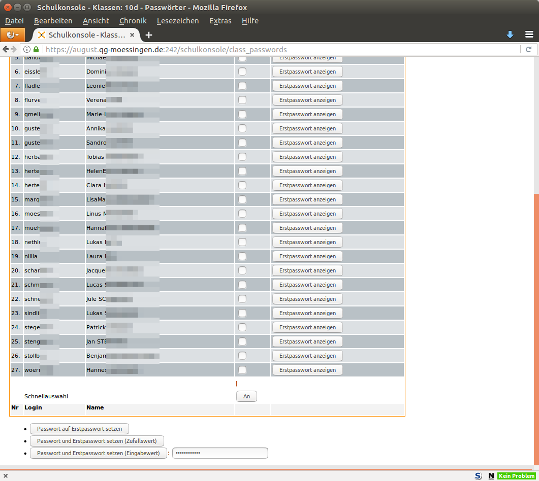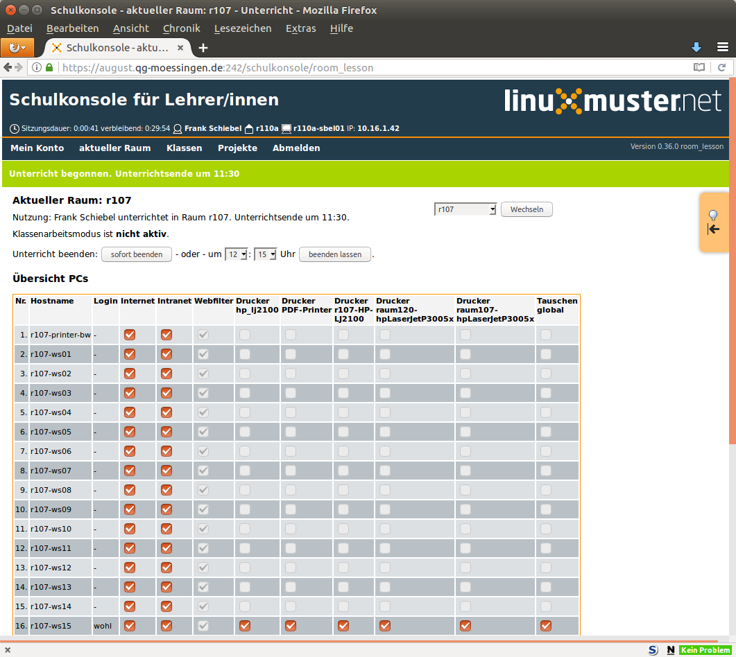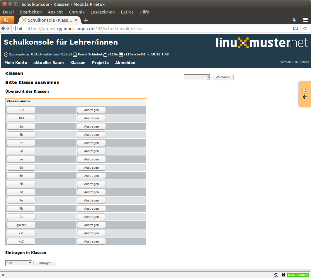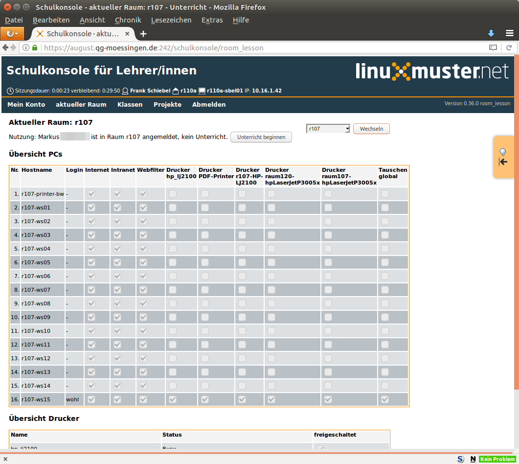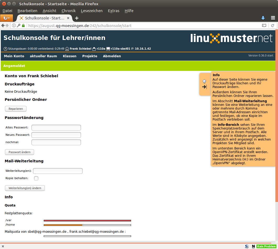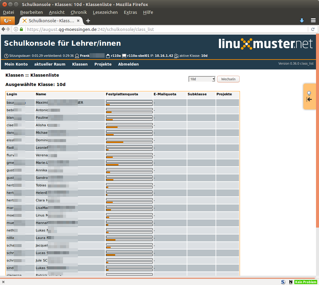 Schulkonsole Das Anmeldefenster der Schulkonsole.Die Statusseite eines angemeldeten Lehrers. Hier können Informationen zu Quotas eingesehen und das Passwort geändert werden.Übersichtsliste aktueller Raum.Management eines Raums, wenn man dort Unterricht begonnen hat.Liste der Klassen, in der der angemeldete Lehrer unterrichtet.Klassenliste mit den Disk-Quotas der Schülerinnen und Schülern.Übersicht der Klassenliste zur Änderung von Schülerpasswörtern.